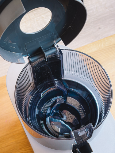 Přestože samotný přístroj funguje na většinu běžných surovin na jednotku, slabinu pocítíte u velmi vláknitých kousků (např. stopkový celer) nebo u příliš měkkého ovoce. Zbytky vláken se někdy hůře posouvají do odpadní nádoby a začnou se hromadit přímo u šneku. Odpad zároveň není vždy úplně suchý a občas z něho cítit, že v něm zůstalo malé množství šťávy. V takových případech pomůže střídat tvrdší a měkčí suroviny nebo využít zabudovaného zpětného chodu motoru.